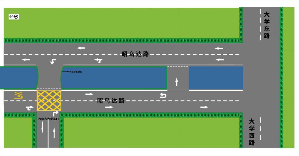 一、优化左转进校流程:昭乌达路自南向北行驶车辆,可在东门处直接左转进校。