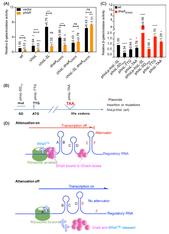 It is found in the research that excess tRNAHis reduces the transcription of the his operon in wt MOR1378 cells and the ΔhisL, ΔhisL‐SL, dnaAA345S mutant derivatives(Fig. 2A), which indicates that excess tRNAHis strengthens the attenuation of the his operon . In the ΔhisL‐SL dnaAA345S and ΔhisL dnaAA345S double mutants, excess tRNAHis exerts no prominent effect on his transcription (Fig.2A), which demonstrates that repression of tRNAHis is dependent on DnaA and His-SL RNA. The destroyed Shine Dalgarno sequence in 5' region of hisL gene, the destroyed start codon of the gene and the inserted stop codon in front of the His codon, will all strengthen the attenuation of his operon(Fig. 2B,C). To sum up, the research proposes a model of a DnaA-dependent riboswitch for transcription attenuation of the his operon(Fig.2D). The model assumes that the binding of DnaA to rDnaA boxes in regulatory RNA of the his operon ensures the formation of the attenuator EF and vice versa. And ribosome loading and tRNAHis loading play a role in transcription attenuation of the his operon.