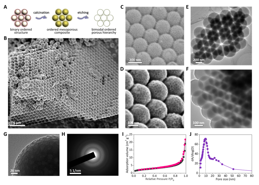 In the process of their studies, the team of Academician Zhao Dongyuan proposed a soft-hard cooperative hierarchical assembly method by which mesoscopic structures with multiple orderliness can be built by assembling the two structure units, i.e. soft micel (tri-block copolymer pluronic F127/polydopamine) and the hard rigid particles (SiO2 nanosphere) in turn into ordered mesoscopic structure and photon crystals. The introduction of SiO2 hard plates can not only tactfully avoid the incompatibility of soft-soft pairs and produce ordered colloid crystals, but also retains its full interaction with F127/polydopamine, thus ensuring the formation of bi-peak ordered structure. The multi-layer porous structure thus produced has excellent porosity (with high specific surface area of 286m²°g-1 and pore volume of 0.31 cm³ g-1) and high binary orderliness in mesoscopic and macroscopic dimensions. In addition, the macropore-mesopore carbon thus obtained exhibits excellent override, circulation property and rapid pseudocapacitance and charge transfer dynamics in sodium ion storage.