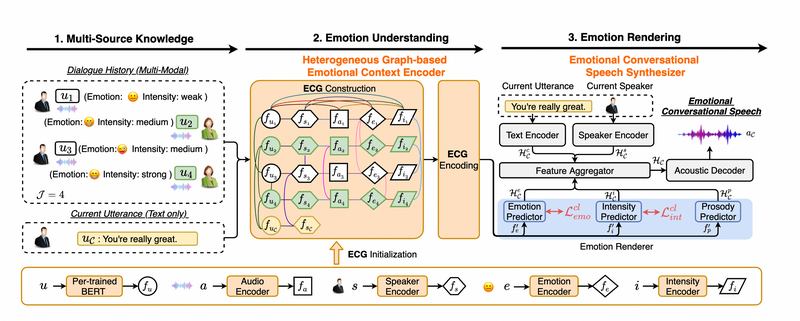 Conversational Speech Synthesis(CSS) intends to give speech expression in conversation in proper intonation and tone and with appropriate emotion. However, due to the lack of the speech dataset of emotional conversation and the difficulty in emotion modeling, there were no in-depth studies of emotion understanding and emotion rendering in the previous research. The research team of Research Fellow Liu Rui with the College of Computer Science(College of Software) of IMU has proposed, in cooperation with the research team of Tiktok(Singapore), a new model for speech synthesis in emotional conversation, called ECSS, which greatly improves the naturalness and emotional expressiveness of synthesized speech in conversation.