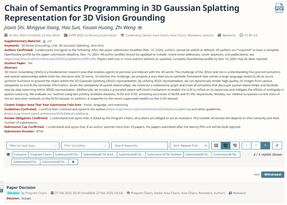 Recently, the China Computer Federation (CCF) announced the acceptance results for the top-tier international conference on computer vision and pattern recognition, CVPR, which is an A-class conference in the field of computer vision. The research work on large-model-based 3D visual localization, titled "Chain of Semantics Programming in 3D Gaussian Splatting Representation for 3D Vision Grounding," was accepted for presentation. The research was conducted by Shi Jiaxin and Xiang Mingyue, undergraduate students from the 2022 class of the School of Electronic Information Engineering, Huang Yixuan, a 2023 undergraduate student, and Sun Hao, an undergraduate from the 2022 class of the School of Transportation.