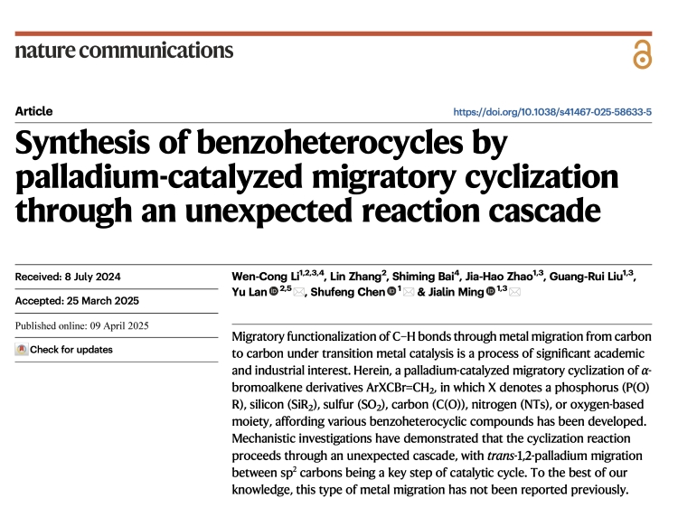 近日,best365官网化学化工学院陈树峰、明佳林教授团队在国际顶级学术期刊Nature Communications(《自然·通讯》)上,发表题目为“Synthesis of benzoheterocycles by palladium-catalyzed migratory cyclization through an unexpected reaction cascade”(https://doi.org/10.1038/s41467-025-58633-5)的重要研究成果。该团队实现了膦杂吲哚及其他吲哚类化合物的高效合成,并且发现了独特的反应机理。该研究工作由李文聪博士担任第一作者,best365官网为第一完成单位,best365官网化学化工学院陈树峰教授、明佳林教授为共同通讯作者,郑州大学蓝宇教授团队提供了重要的理论计算支持。
