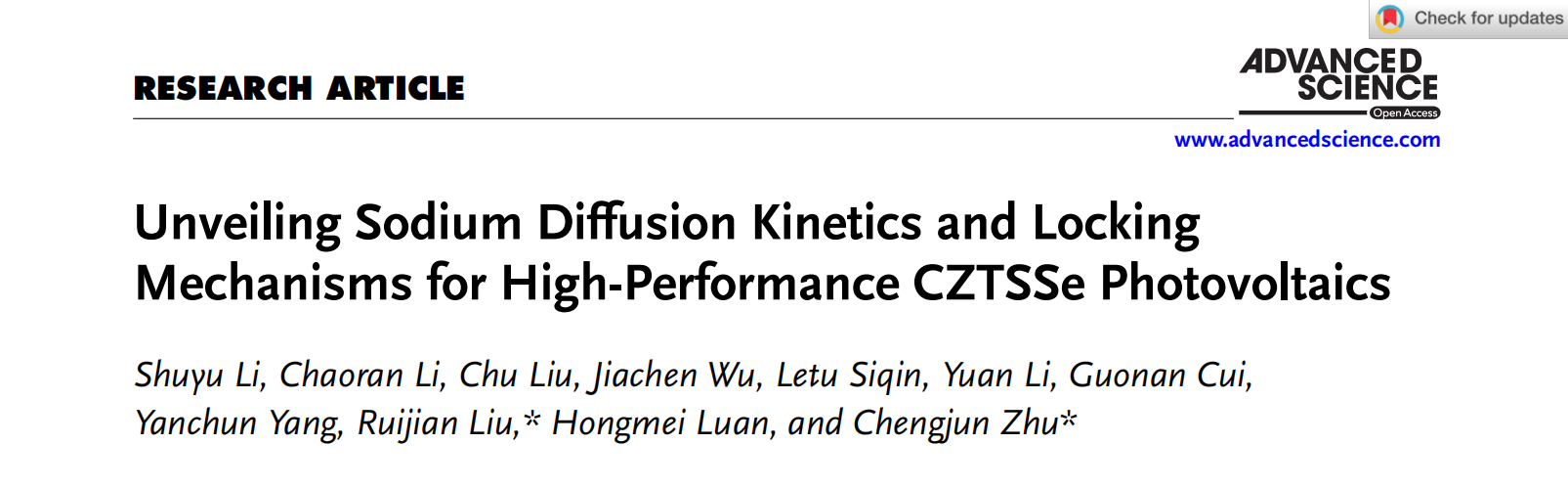 近日,best365唯一官方网站物理科学与技术学院,内蒙古自治区半导体光伏技术与能源材料重点实验室朱成军教授课题组在国际顶级期刊《Advanced Science》(《先进科学》SCI一区TOP,IF 14.3,全文链接:http://doi.org/10.1002/advs.202504087)上发表题为“Unveiling Sodium Diffusion Kinetics and Locking Mechanisms for High-Performance CZTSSe Photovoltaics”的研究论文。