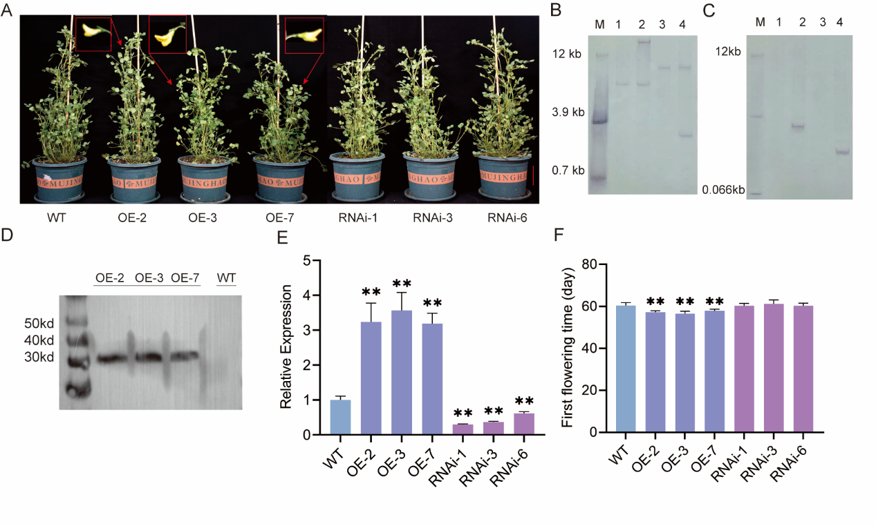 近日,best365官网牧草与特色作物生物学教育部重点实验室牛一丁教授团队利用建立的截型苜蓿遗传转化技术体系,结合Southern Blot、Western Blot、酵母单杂交和双荧光素酶活性检测等技术手段,解析了苜蓿ERF072基因调控截型苜蓿应对干旱胁迫加速开花的作用机制。研究发现ERF072可以直接调控花发育基因MtSOC1-like响应植物应对干旱胁迫加速开花。该研究阐明了豆科牧草应答干旱胁迫的新机制,为进一步深入研究AP2/ERF转录因子在调控植物抗旱性中的作用提供了新进展,也为豆科牧草抗旱分子设计育种提供了新的理论依据和候选基因。