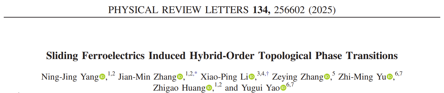 近日,best365官网物理科学与技术学院李小平研究员团队在铁电操控拓扑量子态方面取得重大突破,在物理学顶级期刊Physical Review Letters上发表题为“Sliding Ferroelectrics Induced Hybrid-Order Topological Phase Transitions”的研究成果。(论文链接:https://journals.aps.org/prl/pdf/10.1103/l1n5-1jsm)。李小平研究员为该论文的通讯作者,福建师范大学的张健敏教授为文章的共同通讯作者。