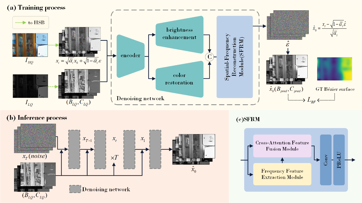 简介:论文提出任务解耦与贝塞尔曲面约束相结合的低光照图像增强方法,用于解决图像亮度不均匀和纹理细节损失的问题。论文设计了一个具有分支结构的扩散模型,将增强过程分为亮度调整和色彩还原,从而实现对亮度均匀性的独立控制。论文使用贝塞尔曲面作为学习目标,对图像施加平滑度约束,解决增强图像亮度不均匀的问题。为了克服贝塞尔曲面可能带来的细节损失,论文引入了基于傅立叶变换的空间频率重建模块,以增强细粒度纹理信息。在多个通用低光照增强数据集上的实验结果表明,论文提出的方法在处理不均匀光照图像时表现出显著优势。