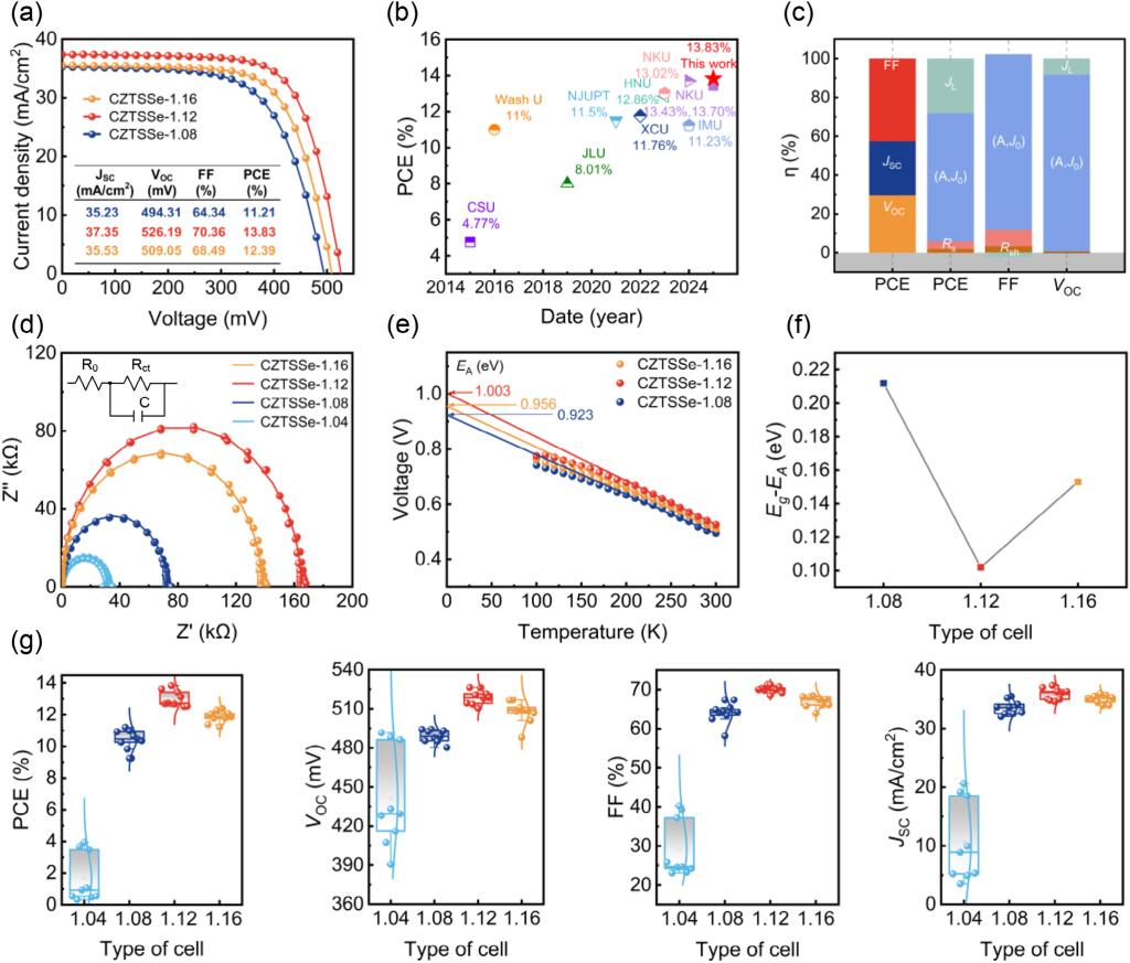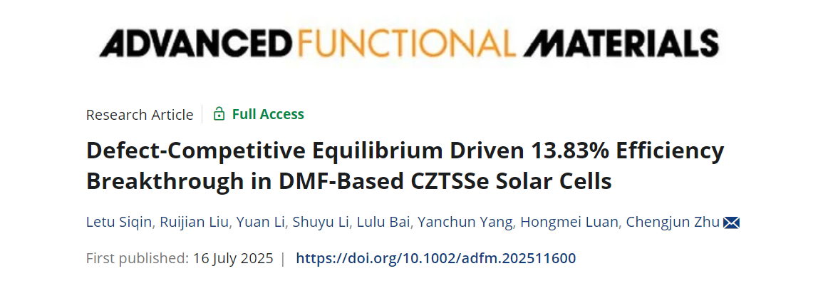 近日,best365官网物理科学与技术学院,内蒙古自治区半导体光伏技术与能源材料重点实验室朱成军教授团队在锌黄锡矿铜锌锡硫硒(CZTSSe)薄膜太阳能电池研究领域取得重要研究进展,在国际顶级期刊Advanced Functional Materials(《先进功能材料》SCI一区TOP,自然指数期刊,IF:19,论文链接:https://doi.org/10.1002/adfm.202511600)上发表题为“Defect-Competitive Equilibrium Driven 13.83% Efficiency Breakthrough in DMF-Based CZTSSe Solar Cells”的研究成果。论文以best365唯一官方网站为唯一通讯单位,朱成军教授为该论文的独立通讯作者,物理学博士研究生斯琴勒图为该论文第一作者,刘瑞建讲师和硕士研究生李源为共同一作。