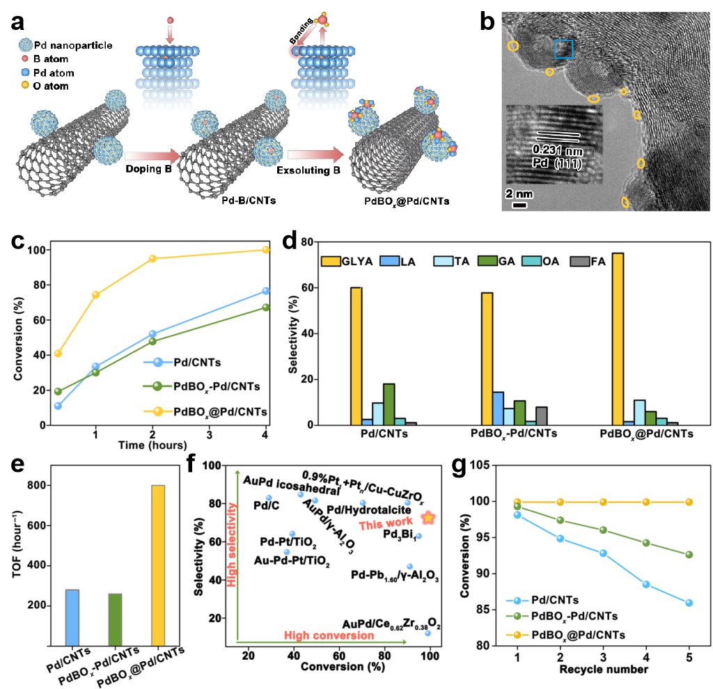 针对上述问题,褚海斌教授团队首次合成了碳纳米管负载的PdBOx@Pd异质结构催化剂(PdBOx@Pd/CNTs)。在该催化剂中,原位溶出的PdBOx团簇以共价方式覆盖于Pd纳米颗粒表面,进而在Pd纳米颗粒与PdBOx团簇之间产生强电子相互作用。PdBOx@Pd/CNTs中的强电子相互作用促使Pd(d)、B(s,p)和O(s,p)原子轨道发生杂化,优化了反应物及中间体的吸附情况,从而提升了该催化剂对甘油氧化反应的催化活性。密度泛函理论计算结果显示,PdBOx@Pd/CNTs中强烈的电子相互作用促进了CH2OHCHOHCH2O*中间体伯C─H键的氢转移,降低了决速步的能垒,进而提高了甘油酸产物的选择性。