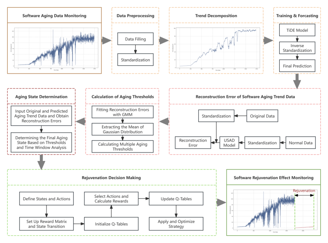 论文聚焦云原生架构中Docker容器平台因软件老化导致运行时可靠性严重下降的问题,系统性地提出了一套TiAD-DQR创新方法。该方法通过趋势分解密集编码器(TDDE)提升长期老化趋势预测精度,结合高斯混合老化检测模型(GMAD)实现自动化老化状态划分,并基于双Q学习(DQL)算法生成兼顾即时响应与长期效益的抗衰策略,综合实验表明,所提方法可显著提升Docker平台的可靠性与服务稳定性。研究成果形成了算力服务平台软件可靠性保障新机制,可为新型融合算力架构中算力服务平台的可靠稳定运行提供技术支撑,以提升整体算力服务能力与应用效率。