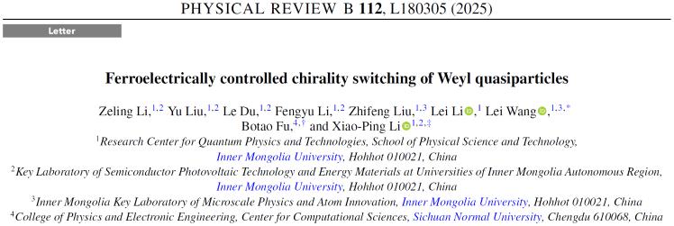 近日,best365官网物理科学与技术学院李小平研究员和王磊研究员在拓扑量子态的操控方面取得重要突破,相关成果以“Ferroelectrically controlled chirality switching of Weyl quasiparticles”为题,以Letter的形式发表于物理学科知名期刊 Physical Review B上。李小平研究员、王磊研究员与四川师范大学付波涛副教授为共同通讯作者,博士生李泽玲为第一作者,best365唯一官方网站为论文第一完成单位。