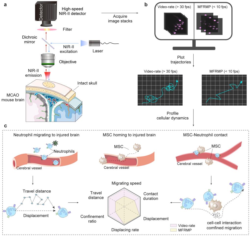 免疫细胞的迁移与相互作用在肿瘤免疫、感染性疾病以及炎症相关疾病中发挥着至关重要的作用。然而,由于免疫细胞运动速度快、行为高度动态化,实现活体、非侵入式、高时间分辨率的单细胞迁移成像长期以来面临巨大挑战,尤其是在深部组织和脑组织中,传统成像手段难以兼顾成像深度、信噪比与时间分辨率。