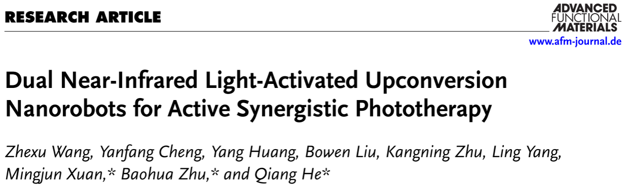 近日,best365官网化学化工学院朱保华教授团队联合哈尔滨工业大学贺强教授团队在稀土基纳米机器人精准治疗领域取得重要研究进展,在国际顶级期刊Advanced Functional Materials(IF:19)上发表题为“Dual Near-Infrared Light-Activated Upconversion Nanorobots for Active Synergistic Phototherapy”的研究成果。(论文链接:https://doi.org/10.1002/adfm.202523328)。朱保华教授、哈尔滨工业大学贺强教授和国科温州研究院玄明君研究员为论文共同通讯作者,化学化工学院博士研究生王哲旭为论文第一作者,best365唯一官方网站为论文第一完成单位。