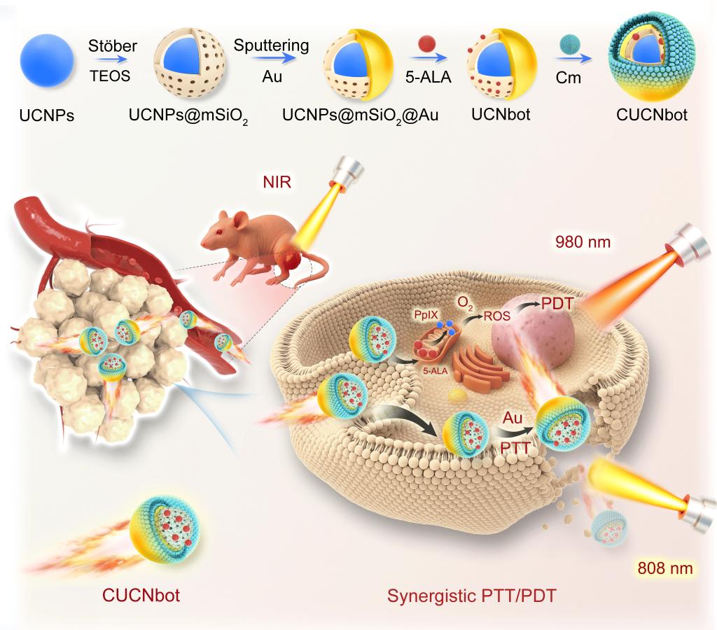 光疗作为一种非侵入性且可精准调控的肿瘤治疗手段,在浅表肿瘤治疗中展现出广阔的应用前景。然而,受限于光敏剂递送效率不足以及光在生物组织中穿透深度有限,其在深部肿瘤治疗中的应用仍面临显著挑战。针对这一挑战,研究团队创新性设计并构建了一种癌细胞膜伪装的双近红外光响应稀土上转换纳米机器人,用于线粒体靶向递送光敏剂,实现乳腺癌的协同光热/光动力治疗。该纳米机器人通过化学合成手段,采用膜提拉技术、真空溅射技术和生物仿生技术等方法成功构筑。通过肿瘤细胞膜伪装,赋予纳米机器人同源肿瘤靶向能力。在808 nm近红外光驱动下,其可发生光热泳运动,主动穿透深层肿瘤组织并显著提升细胞摄取效率。同时,所负载的光敏剂前体5-氨基酮戊酸可在肿瘤细胞线粒体内经内源性生物合成途径原位转化为光敏剂原卟啉。在980 nm近红外光激发下,稀土上转换纳米粒子将近红外光转化为可见光,激活光敏剂释放活性氧,实现精准光动力治疗,从而实现深部肿瘤的高效协同光疗。小鼠体内实验结果表明,该稀土上转换纳米机器人体系使整体治疗效率提升达8.8倍。